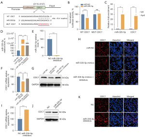 Using the ENCORI/starBase database, we predicted the interaction network of DE genes and constructed a ceRNA regulatory network comprising 3 lncRNAs, 12 miRNAs, and 21 mRNAs (Figure 1E). Unlike other potential interactions in HCC progression, the KCNQ1OT1/miR-335-5p/CDC7 axis has a unique regulatory role that could be significant in this network. Evidence shows that CDC7 plays a critical role in the cell cycle and DNA replication pathways (18). Therefore, we generated a Kaplan-Meier survival curve using the GEPIA 2 database, which indicated that patients with high expression levels of KCNQ1OT1 and CDC7 had a poor prognosis (Figure 1F,1G). To substantiate the clinical significance of this axis in HCC, expression level analyses were performed using the UALCAN database. The results revealed that both KCNQ1OT1 and CDC7 were expressed at significantly higher levels in tumor tissues than in normal tissues (Figure S11E,S11F), whereas miR-335-5p exhibited reduced expression in the HCC specimens (Figure S11G). Expression levels were closely related to and varied with tumor malignancy grade (Figure 1H-1J). These data indicated that the KCNQ1OT1/miR-335-5p/CDC7 axis is functionally significant and clinically relevant in HCC. A roadmap for the screening and validation processes of the key functional axis is shown in Figure S12.