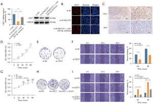 As previously reported, ceRNAs can competitively bind and sequester miRNAs from their original target transcripts, thereby preventing miRNA-induced degradation or suppression of target mRNAs (22). To clarify whether KCNQ1OT1 regulates the progression of HCC via the miR-335-5p/CDC7 axis, we transfected miR-335-5p inhibitors into KCNQ1OT1 knockdown HCC cells. Using qRT-PCR, WB and immunofluorescence assays, we found that CDC7 expression at the mRNA and protein levels was inhibited by KCNQ1OT1 knockdown and markedly reversed by miR-335-5p inhibitors (Figure 5A,5B). Furthermore, immunohistochemistry results showed that CDC7 expression in HCC tissues was significantly higher than that in ANT (Figure 5C). This finding further confirms that the abnormal expression of CDC7 in HCC cells is a significant factor influencing HCC progression.