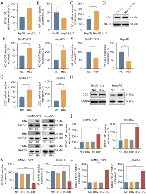 Studies have shown that HBV-encoded proteins are involved in numerous intracellular signaling pathways and play important roles in HBV-related HCC (2,24,25). To identify the specific HBV-encoded proteins responsible for activating this signaling axis, we transiently transfected SMMC-7721 and differentiated HepaRG cells with HBx, HBs, and HBc recombinant plasmids for 48 h. WB results showed that the HBx, HBs and HBc proteins were expressed in the cells (Figure 6I). Meanwhile, qRT-PCR results revealed that transfection with HBc substantially increased KCNQ1OT1 and CDC7 expression and decreased miR-335-5p expression compared to other HBV proteins (Figure 6J-6L, Figure S14). Consequently, the KCNQ1OT1/miR-335-5p/CDC7 axis may serve as a potential therapeutic target for HCC and offering new treatment options for patients with HBV-related HCC.