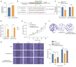 Subsequently, CCK-8 and colony formation assays verified that KCNQ1OT1 knockdown inhibited HCC proliferation, whereas the wound healing assay demonstrated an inhibitory effect of KCNQ1OT1 knockdown on HCC migration. Furthermore, the effect of KCNQ1OT1 on the proliferation and migration in SMMC-7721 cells was counteracted by miR-335-5p inhibitors (Figure 2E-2G). Therefore, KCNQ1OT1 promoted the proliferation and migration of HCC cells by negatively regulating miR-335-5p.