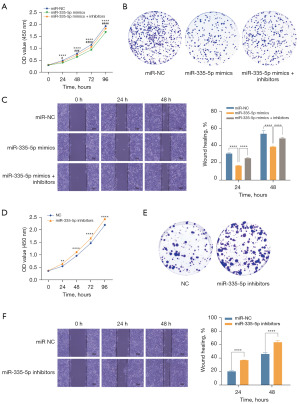 Given that KCNQ1OT1 may function by inhibiting miR-335-5p, we further investigated the biological role of miR-335-5p. HCC cells were transfected with miR-NC or miR-335-5p mimics, or co-transfected with miR-335-5p mimics and inhibitors. Our results indicated that miR-335-5p overexpression inhibited HCC cell proliferation and migration, an effect that was reversed by miR-335-5p inhibitors (Figure 3A-3C). Conversely, miR-335-5p inhibitors markedly enhanced cell proliferation and migration (Figure 3D-3F). Hence, the above results confirm that miR-335-5p suppresses HCC progression.