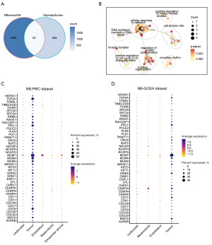 Further exploration of the expression patterns of these 43 genes at the single-cell level was performed using two neuroblastoma single-cell RNA sequencing datasets: PMC and GOSH. Analysis of these datasets demonstrated that the majority of the overlapping genes were predominantly expressed in tumor cells (Figure 1C,1D). This observation underscores the potential role of these genes in neuroblastoma tumorigenesis and highlights them as possible targets for therapeutic intervention.