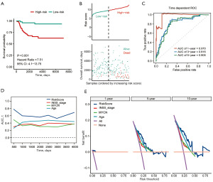 Furthermore, we compared the clinical utility of the RiskScore with conventional prognostic factors using DCA. The DCA curves revealed that our RiskScore model provided the highest net benefit across a range of threshold probabilities in the validation set (Figure 3E), suggesting superior potential for guiding clinical decision-making.