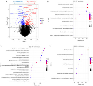 We then investigated the mechanisms and signaling pathways that contribute to the effects of METTL11A. Differential expression analysis was performed using the top 30% of samples with high METTL11A expression and the top 30% of samples with low METTL11A expression, which identified 237 significantly upregulated genes and 263 significantly downregulated genes (Figure 4A). Gene Ontology (GO) and Kyoto Encyclopedia of Genes and Genomes (KEGG) enrichment analyses were performed for these genes. In molecular function enrichment (GO-MF), the top 5 enriched terms were “signaling receptor activator activity”, “olfactory receptor activity”, “phosphotransferase activity”, “proton transmembrane transporter activity”, and “polyubiquitin modification-dependent protein binding” (Figure 4B). In biological process enrichment (GO-BP), the top 5 enriched terms were “negative regulation of cell differentiation”, “negative regulation of intracellular signal transduction”, “sensory perception of smell”, “cellular homeostasis”, and “regulation of MAPK cascade” (Figure 4C). The KEGG enrichment results indicated that “MAPK signaling pathway” and “cAMP signaling pathway” were activated in high METTL11A samples (Figure 4D).