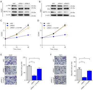 It has been reported that the activation of the MAPK pathway is closely associated with tumor growth and progression (15). Based on the enrichment analysis results, we hypothesize that the pro-tumorigenic function of METTL11A may be associated with MAPK pathway activation. The WB results showed that the total p38 protein level remained unchanged, while p-p38 was significantly reduced (Figure 5A,5B). To further delineate the functional association between METTL11A and the MAPK pathway, we employed C16-PAF, a selective p38-MAPK inhibitor. Strikingly, treatment with C16-PAF effectively rescued the proliferation and migration capacities of AML cells following METTL11A knockdown (Figure 5C-5F), suggesting that METTL11A exerts its oncogenic effects predominantly through p38-MAPK signaling.