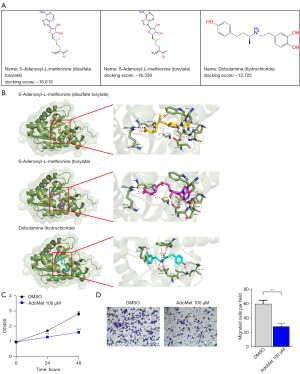 To evaluate the potential drugs targeting METTL11A, the FDA-approved drug database was employed for molecular docking. The top 3 drugs, which were predicted to bind METTL11A, were S-Adenosyl-L-methionine disulfate tosylate (AdoMet, score: −16.618), S-Adenosyl-L-methionine tosylate (score: −16.338), and hydrochloride (score: −12.725; Figure 6A). The interaction model of the three drugs and METTL11A were visualized by Pymol software (Figure 6B). The interaction of disulfate tosylate-METTL11A consists of seven hydrogen bonds, one π-cation interaction, one π-π interaction, and one salt bridge as shown. We evaluated the top-ranked compound AdoMet. At a concentration of 100 µM, it significantly inhibited the proliferation and migration capabilities of HL-60 cells (Figure 6C,6D). The results provide potential inhibitors for METTL11A and therapeutic drugs for AML patients.
