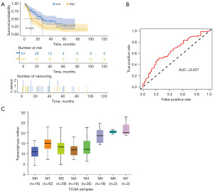 The expression of METTL11A in AML was analyzed using TCGA database data. In the cohort, the patients with high METTL11A expression showed worse overall survival than those with low METTL11A expression (Figure 1A, P=0.01). The median survival time in the high METTL11A group is 27.4 months, while 10.2 months for the low METTL11A group. Subsequently, we found that single METTL11A gene can predict the overall survival rate in AML patients with the area under curve (AUC) of 0.657 (Figure 1B). It indicates that METTL11A could serve as a favorable survival biomarker for AML patients. Then, we analyzed the expression of METTL11A in different types of AML. The results show that METTL11A is rather high in M5 patients. Although the M6 and M7 types are also related to elevated METTL11A level, only 2 and 3 cases were recorded (Figure 1C).