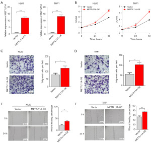 In order to explore the relationship between METTL11A and AML in depth, we overexpressed (OE) METTL11A by constructing stably-transfected AML cell lines, HL60-METTL11A-OE and THP1-METTL11A-OE. The expression was confirmed by reverse transcription quantitative polymerase chain reaction (RT-qPCR) and Western blot (WB) in both cell lines (Figure 2A, Figure S1). Cell growth was notably accelerated in METTL11A-OE cells, as shown by CCK-8 cell viability analysis (Figure 2B). Through transwell assay, METTL11A-OE cells exhibited significantly increased migration capacity than vector cells (Figure 2C,2D). Moreover, the scratch wound assay further confirmed the enhanced migratory ability in the OE cells (Figure 2E,2F). These results suggest that METTL11A promotes the malignant behavior in AML cells.