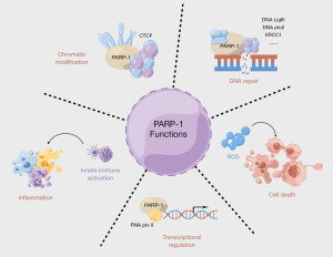 PARP-1 is the first and most extensively studied subtype of PARP, with multiple functions and accounting for over 90% of PARPs activity (4). PARP-1 operates mainly in the nucleus, where it regulates various cellular processes such as DNA repair, chromatin remodeling, gene expression, and cell death by synthesizing poly(ADP-ribose) (PAR) chains (Figure 1). A major function of PARP-1 is to participate in DNA damage response and repair. Upon single or double-strand DNA breaks in cells, PARP-1 rapidly recognizes and binds to the damaged site, using nicotinamide adenine dinucleotide (NAD+) as a substrate to transfer ADP-ribose units to itself or other target proteins, forming PAR chains (16). These PAR chains act as signaling molecules, recruiting and activating other enzymes involved in DNA repair, such as DNA ligase III (LigIII) (17), DNA polymerase β (polβ) (18), and scaffold protein X-ray repair cross-complementing gene 1 (XRCC1) (19). After repair is completed, the PAR chains are degraded, restoring the cell to its normal state. Moreover, PARP-1 can stabilize replication forks by interacting with them, thereby maintaining genome stability (16). Besides DNA repair, PARP-1 has other functions such as modulating chromatin structure, influencing gene expression and epigenetic modification (20-22). Furthermore, PARP-1 can facilitate the loading and retention of RNA polymerase II at active promoters by interacting with it and enhance the transcriptional activation of downstream genes (23,24). Since PARP-1 plays a crucial role in maintaining genome stability and regulating cell fate, its overactivation can result in cell death or mutation, making it closely associated with various diseases such as cancer, neurodegenerative diseases, and inflammation. Exploring the function and mechanism of PARP-1 is of great importance for understanding life phenomena and developing new therapeutic strategies for related diseases.