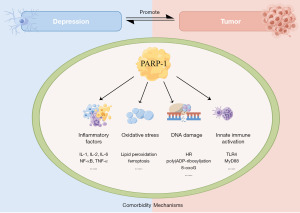 Tumors and depression have a complex comorbid relationship and are mutually associated with increased risk (25,26). The exact mechanisms underlying this comorbidity are not fully elucidated, but recent evidence suggests that PARP-1 may be a key mediator through its effects on downstream molecular pathways, such as inflammation, innate immunity, DNA damage repair, and oxidative stress etc. (Figure 2).
