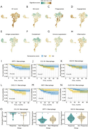 Based on the notable differences in senescence gene expression across macrophage subsets, we calculated typical phenotype scores for macrophages, such as those for antigen processing and presentation, inflammation, angiogenesis, immunosuppression, phagocytosis, and complement. Indeed, low-senescent macrophages scored high in antigen processing and presentation. However, high senescent macrophages scored high in complement, immunosuppression, angiogenesis, phagocytosis, and inflammation (Figure 4E). We overlaid the different phenotypic scores onto UMAP and found that these phenotypic differences were mainly between SPP1+, ISG15+, and CCL18+ macrophages (Figure 5A-5H). In addition to the common M1/M2 phenotype, we also assessed the functional phenotype of macrophage subpopulations using angiogenic and phagocytic characteristics with reference to the tumor-associated macrophages (TAMs) dichotomous functional phenotype of Zhang et al. (28), and found that SPP1+ macrophages selectively express genes engaged in angiogenesis, whereas CCL18+ macrophages showed significantly higher phagocytic scores. Although both ISG15+ and SPP1+ macrophages were featured by elevated expression of senescent genes, the functional phenotypes of macrophages appear to be quite different between the two, and interestingly the ISG15+ macrophages phenotype is more similar to that of CCL18+ macrophages.