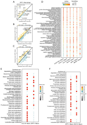 The R package ClusterProfiler (version 4.8.3) was used to pinpoint genes uniquely overexpressed in distinct cell subpopulation, the top 100 genes of each cluster were obtained, bitr was used for ID replacement, and org.Hs.eg.db for Gene Ontology (GO) annotation (see table online https://cdn.amegroups.cn/static/public/tcr-2025-659-3.xlsx), ggplot2 was used to show individual cluster enrichment pathways through dot plots. The scMetabolism was used to quantify single-cell metabolism: the method was selected as AUCell, and the metabolism.type was selected as Kyoto Encyclopedia of Genes and Genomes (KEGG).