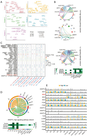 As shown in Figure 8A, from the perspective of functional similarity pairs, the functional similarity subgroup five mainly contained inflammation-related pathways, including IL-6, and IL-1. The circle diagram suggests that the isolated senescent cells cluster in these inflammatory pathways as senders or receivers (Figure 8B). Therefore, we speculate that senescent cell clusters are mainly regulated through these pro-inflammatory SASPs. In addition to common pro-inflammatory factors, we found that ANGPTL was significantly expressed in clusters of senescent cells, with C3 and C5 being the main sources of this pathway (Figure 8C,8D). Specific signaling molecules, such as ANGPTL4, are secreted by C3/C5 cell clusters, whereas clusters expressing the corresponding receptors (ITGA5 + ITGB1, SDC2/3/4) act as target cells, with SDC4 being specifically expressed in SPP1+ macrophages, and thus ANGPTL4-SDC2 may be a key target of senescent epithelial cells and SPP1+ macrophages (Figure 8E).