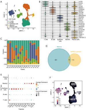 Following the normalization of gene expression, we employed PCA to assess genes with varying expression levels and then utilized graph-based clustering to accurately categorize the cells into distinct clusters. We labeled the cell clusters using the mean expression of selected gene sets and detected immune cells (myeloid cells, T cells and B cells, plasma cells) and epithelial cells (Figure 1A). Violin maps were drawn based on the top 5 genes for each cell subpopulation (Figure 1B). Figure 1C shows the distribution and differences of the cell subpopulations in the TME of patients with NPC. A total of 12 genes were identified through the overlap of senescence-related and cellular subpopulation-specific genes (Figure 1D). Active cellular subpopulations identified based on the expression of these 12 senescence markers were used to study the expression patterns of senescence genes at the single-cell level. Figure 1E,1F show dot plots and UMAP plots of active cells, which indicate that epithelial cells and myeloid cells were active cell groups. Therefore, we focused on the epithelial cells and the myeloid lineage and extracted the two clusters of cells for further analysis.