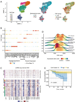 We devised a senescent gene set screener panel and found that the gene set was highly expressed in C3, C5, and C6. Interestingly, the percentage of CNVhigh cells in each epithelial cell subpopulation was positive correlation with the proportion of highly active senescent genes (Figure 2A), especially in C3. We obtained progression-free survival (PFS) data from GSE102349 (21), and the abundance of high CNV, late-state C3, was significantly associated with poorer PFS (Figure 2E).