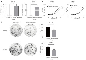 Tumor cell proliferation is one of the most significant indicators of a malignant phenotype. To determine the biological effects of SNORD93 on CRC tumor progression, we upregulated the expression of SNORD93 in the HCT-15 and HT-29 cells via transfection with pGPU6-SNORD93. The transfection of pGPU6-SNORD93 markedly enhanced the expression of SNORD93 in both the HCT-15 and HT-29 cell lines (HCT-15: P=0.004; HT-29: P=0.01; Figure 2A). As expected, the CCK-8 assay confirmed that the proliferation was inhibited when the SNORD93 expression in CRC cell lines was increased (HCT-15: P<0.001; HT-29: P=0.03; Figure 2B). In line with this, the colony formation assay indicated that overexpression of SNORD93 resulted in fewer and smaller colonies of CRC cells (HCT-15: P=0.002; HT-29: P=0.02; Figure 2C). Taken together, these investigations suggest that the overexpression of SNORD93 significantly constrains the proliferation ability of CRC cells.