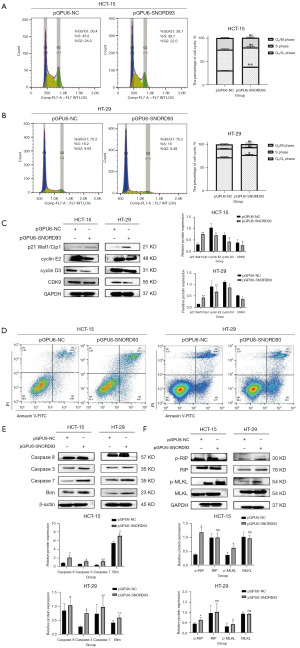 Evasion from apoptosis is one of the hallmarks of cancer, and deregulated apoptotic signaling induces continuous proliferation, ultimately leading to the formation of cancer (18). To further elucidate the mechanism by which SNORD93 affects CRC cell proliferation, we conducted Annexin V/PI staining on CRC cells after they were transfected with pGPU6-NC or pGPU6-SNORD93 to analyze cell death and apoptosis. The upregulation of SNORD93 increased the proportion of apoptotic cells (Figure 3D and Table 2). Subsequently, we measured the expression of apoptotic proteins and found that SNORD93 stimulated the expression of caspase 3, caspase 7, caspase 8, and Bim (Figure 3E). In addition, the phosphorylation of both RIP and mixed lineage kinase domain-like protein (MLKL), which are essential cellular elements during necroptosis, increased in pGPU6-SNORD93-treated CRC cells (Figure 3F). SNORD93 dysregulation coincides with elevated necroptosis marker, the p-RIP/p-MLKL, suggesting potential engagement of necroptosis. Our in vitro findings demonstrated that SNORD93 overexpression hinders the proliferation of CRC by arresting the cell cycle and inducing apoptosis.