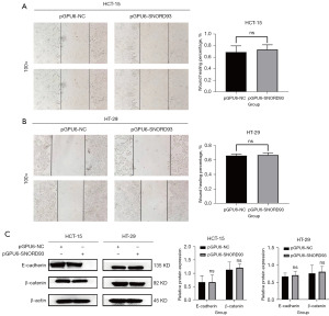 Tumor metastasis is a characteristic trait of the most aggressive tumors and a major contributor to cancer-related death. Epithelial-mesenchymal transition (EMT) is an essential cellular process in which epithelial cells exhibit mesenchymal characteristics. Generally, EMT has been associated with various tumor functions, including tumor cell migration, metastasis (19), and chemotherapy resistance (20). We thus sought to clarify SNORD93’s biological role in metastasis and the expression of EMT-related genes. As shown in Figure 4A,4B, the migration capacity of CRC cells was not altered in response to SNORD93 overexpression. Additionally, the expression of E-cadherin and β-catenin showed no significant difference between the control and SNORD93-overexpressing groups (Figure 4C). Therefore, the overexpression of SNORD93 exerted a nonsignificant effect on the migratory capacity of CRC cells.