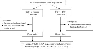 In addition, the anticancer effects of DBT are reportedly achieved through the modulation of different mechanisms and pathways (22,27,28). In vitro evidence has shown that DBT can sensitize the murine colon carcinoma cell line (CT26) to RT and increase the therapeutic effect of CCRT in CT26 cells (22) and is capable of inducing autophagy-associated cell death in CT26 cells by triggering the mTOR/p70s6k signaling pathway, leading to the activation of Atg7 (an autophagy-related protein) (27). In an in vivo experiment, DBT inhibited metastatic colon cancer by upregulating the expression of Bax, caspase-3, and cleaved caspase-3 and by downregulating the expression of Bcl 2 (28). Therefore, we investigated whether a combination of DBT and CCRT for treating NPC could influence the patients’ immunity and explored the possible modulated signaling pathways using next-generation mRNA sequencing. We present this article in accordance with the CONSORT reporting checklist (available at https://tcr.amegroups.com/article/view/10.21037/tcr-2025-406/rc).