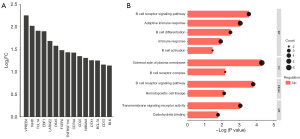 The transcriptomic results of the DBT and placebo groups were compared. The leading upregulated DEGs in both groups are displayed in Figure 2A. The majority of the upregulated DEGs were associated with B cell receptor signaling and development, such as BLK, CD72, CD22, CD79A, FCER2, PAX5, EBF1, and VPREB3. One downregulated DEG (LOC122526776) was found, but it was a novel gene without clear function. Furthermore, functional and enrichment analyses of these upregulated DEGs were performed using DAVID (Figure 2B). The predominant BPs were B cell receptor signaling pathway, adaptive immune response, B cell differentiation, immune response, and B cell activation. The possible mechanism by which DBT exerted its effect was through the B cell receptor signaling pathway. Therefore, DBT could modulate patients’ immunity through the B cell receptor signaling pathway.