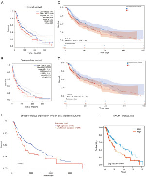 Analysis of the GEPIA2 database categorized SKCM patients into high-expression (n=229) and low-expression (n=229) groups based on median UBE2S levels. Patients with high UBE2S expression had significantly worse OS (P=0.02, Figure 2A) and DFS (P=0.02, Figure 2B) compared to those with low expression. Similarly, the Sangerbox database revealed that the OS for the high-expression group (n=222) was significantly lower than that for the low-expression group (n=222, P=0.01, Figure 2C), and DSS was also poorer in the high-expression group (n=219) compared to the low-expression group (n=219, P=0.02, Figure 2D). The Ualcan database, using UBE2S expression quartiles, found that the OS for the high-expression group (n=115) was significantly worse than for the low/moderate-expression group (n=344, P=0.02, Figure 2E). The TISIDB database further supported these findings, showing poorer prognosis for high-expression patients (P=0.003, Figure 2F). Collectively, these results from multiple databases consistently highlight that high UBE2S expression is a significant prognostic marker for SKCM patients.