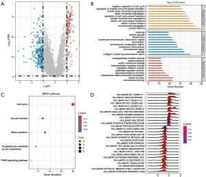 The differential expression of stemness subgroups was analyzed using the “limma” R package [|log2 fold change (FC)| >1, false discovery rate (FDR) <0.05] (24). At the same time, differential genes were analyzed via Gene Ontology (GO) and Kyoto Encyclopedia of Genes and Genomes (KEGG) enrichment using the “clusterProfiler” R package to identify functional distinctions between the two subtypes (21,25,26). In addition, hallmark gene sets were fetched from the Molecular Signatures Database (MSigDB) and gene set enrichment analysis (GSEA) was performed between stemness molecular subtypes (27). A normalized enrichment score (NES) was created to assess differences in cancer-associated classical pathways between molecular subtypes.