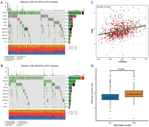 Accumulation of somatic mutations results in the growth of cancerous tumors. Thus, the landscape of somatic mutations between stemness subtypes was analyzed. There is a relatively high frequency of somatic mutations in C2, characterized by high mutation frequencies in TP53, PIK3CA, and TTN. Of these, PIK3CA tended to be the most mutated gene in both typologies, and it was the most frequently mutated gene in C1 (Figure 6A,6B). TP53 was a common mutation in C2 (Figure 6B). The expression level of mRNAsi was found to be proportional to TMB, and TMB was notably greater in the C2 subgroup. (Figure 6C,6D). The results suggest that there may be potential for variation in immune infiltration and response to immunotherapy in the stemness subtype.
