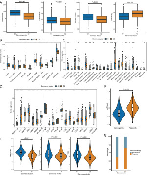 The “estimate” R package was utilized to assess differences in stromal, immune, ESTIMATE score and tumor purity among stemness molecular subtypes (28). ESTIMATE is a tool that uses gene expression profiles to derive stromal and immune cell abundance in tumor tissue. The MCPcounter algorithm can use transcriptome data to quantify the absolute abundance of stemness molecular subtypes for 8 immune cells (CD3+ T cells, CD8+ T cells, cytotoxic lymphocytes, NK cells, B lymphocytes, monocytes, myeloid dendritic cells, and neutrophils) and 2 stromal cells (fibroblasts and endothelial cells) (29). In addition, based on the principles of linear support vector regression, CIBERSORT is a framework for the deconvolution of known gene-expressed profiles characterizing immune cells (30). Immune cell infiltration between stemness molecular subtypes was assessed by the “CIBERSORT” R script with the gene expression signature set LM22 of 22 immune cell subtypes.