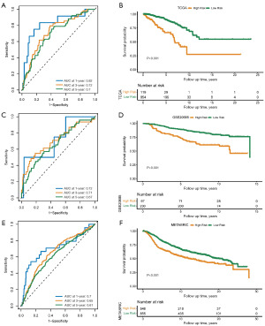 To improve understanding of the link between mRNAsi-related genes and outcomes in BC individuals, a risk model was built from target genes using the TCGA-BRCA cohort. Seven signature genes (BEND5, TNN, PDLIM4, CD24, POP1, PRDX1, PGK1) were selected by the LASSO regression algorithm at λ=5 (Figure S2). A risk model was generated with the minimum error solution after screening (Table 1) and computed to be risk score = −0.0654*BEND5 − 0.1023*TNN − 0.0930* PDLIM4 + 0.0816*CD24 + 0.0995* POP1 + 0.1828* PRDX1 + 0.3399* PGK1. The model was subsequently used to compute risk scores for the TCGA-BRCA cohort and two external validation cohorts (GSE20685 and METABRIC). We observed in the TCGA-BRCA cohort that receiver operating characteristic (ROC) analysis revealed better survival prediction at 1, 3, and 5 years, with an area under the curve (AUC) ≥0.6 (Figure 8A). And based on the ideal threshold criteria, the TCGA-BRCA cohort was divided into high- and low-risk groups. The survival curves showed that the outcomes of the high-risk group were worse (Figures 8B). Furthermore, we also observed the same results in two external validation cohorts (Figure 8C-8F). These findings suggest the risk score model related to mRNAsi has good predictability for the prognosis of BC patients.