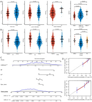 Univariate Cox analysis showed that tumor infiltration, lymph node metastasis, distant metastasis, pathological stage, and risk score were all strongly linked with the outcome in BC patients, with an HR risk score of 3.38 (P<0.001) (Table 2). In order to ensure robust independence assessment while avoiding multicollinearity, the risk score and basic variables (including tumor infiltration, lymph node metastasis, and distant metastasis) were incorporated into the multivariate Cox regression analysis, rather than the composite American Joint Committee on Cancer (AJCC) stage. Multivariate Cox analysis demonstrated that the risk score could be an independent prognostic factor [hazard ratio (HR) =3.58, P<0.001] (Table 2). The nomogram, combined with the risk score, age, tumor infiltration, lymph node metastasis, and distant metastasis can be used to forecast the survival rate of BC individuals at different periods (Figure 9C). After verification by the Bootstrap method, the adjusted C-index of this model was 0.76, indicating that it has a good ability to distinguish. Moreover, the calibration curves in the 3- and 5-year periods were well-fitted (Figure 9D), showing that the nomogram has excellent predictability and can help in the clinical detection and management of BC patients.