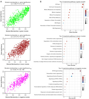 This will be used to further validate the efficiency of the three modules. Scatter plots showed that there was a good correlation between module membership and the gene significance of these modules (Figure 3A). The target modules for subsequent study were therefore the green, brown, and magenta modules. Pathway enrichment analysis found that the genes within the magenta module were mainly focused on the pathways of G protein-coupled receptor (GPCR)-ligand binding, nuclear receptor signaling, extracellular matrix (ECM) organization and NTRK signaling (Figure 3B). The genes in the brown module focus on ECM degradation, ECM proteoglycans and collagen formation in the context of the TME (Figure 3B). In contrast, the genes in the green module are focused on the cell cycle pathway associated with mitosis (Figure 3B). The genes in the targeted modules are strongly linked with tumor development.
