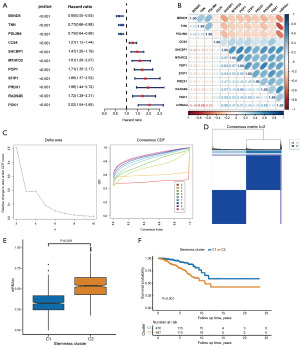 After selection of the target modules that were specifically correlated with mRNAsi, we carried out univariate Cox regression analyses for genes in the target modules to search for those that were robustly related to overall survival in BC individuals (P<0.001). Consensus clustering of cohorts, in TCGA-BRCA, was performed using mRNAsi-associated genes linked to prognosis in BC patients via the “ConsensusClusterPlus” R package (23).