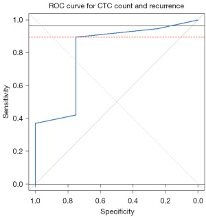 To evaluate the stability of the prognostic association, we repeated the analyses using higher CTC thresholds. Raising the cut-off from ≥3 to ≥5 or ≥10 cells per 5 mL reduced the positivity rate from 91.3% to 65.2% and 43.5%, respectively (Table 4, Figure 2). The OR for recurrence remained directionally consistent but lost statistical significance [≥5: OR =2.9, 95% confidence interval (CI): 0.8–10.1, P=0.08; ≥10: OR =2.1, 95% CI: 0.6–7.4, P=0.24], indicating that the prognostic value is threshold-dependent.
