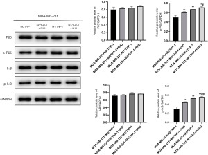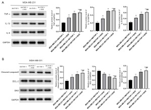 After coculture for 48 hours, MDA-MB-231 cells from the coculture were collected, and proteins were extracted and collected via RIPA lysis buffer, mixed with 10 µL of phosphatase inhibitor, 1 µL of protease inhibitor, and 5 µL of 100-mM phenylmethylsulfonyl fluoride. The protein concentrations of each group were determined with a BCA kit. Subsequently, electrophoresis was conducted, blocking was performed with 10% milk powder for 2 hours, and incubation with primary antibodies anti-BAX (diluted to 1:5,000), anti-BCL-2 (diluted to 1:2,000), anti-cleaved caspase 3 (diluted to 1:2,000), anti-P65 (diluted to 1:2,000), anti-p-P65 (diluted to 1:5,000), anti-IκB (diluted to 1:1,0000), anti-p-IκB (diluted to 1:500), and anti-IL-6 (diluted to 1:1,000) was completed. After another wash, secondary antibodies were added and incubated for 2 hours at room temperature. ImageJ software (US National Institutes of Health, Bethesda, MD, USA) was used to analyze the gray scale.