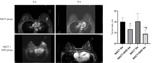 Tumor size was measured via breast MRI scanning with enhancement before treatment and after 9 weeks of treatment in the NACT + SHD group and NACT group. As shown in Figure 6, the difference in tumor size between the two groups at 0 weeks was not statistically significant. After 9 weeks of treatment, the tumor size of both groups was significantly reduced (P<0.01), with the tumor size reduction being significantly greater in the NACT + SHD group than in the NACT group (P<0.05).