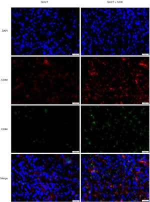 In order to examine SHD’s regulation of M1 macrophages, immunofluorescence staining of tumor tissue was carried out after surgery. Immunofluorescence staining (Figure 7) indicated that CD68-positive cells were present in the two groups. However, in the NACT group, CD86 expression was weak, while that in the NACT + SHD group was relatively strong. We thus concluded that M1 macrophages are highly expressed in the tumor tissues of patients with BC. Taken together, these results indicated that SHD ameliorates BC development in vivo, potentially via the regulation of M1 macrophages polarization.