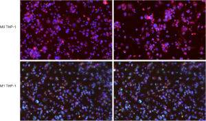 CD68+ and CD86 double labels were used to detect M1 macrophage marker proteins. The immunofluorescence results showed that after stimulation with 5 ng/mL of PMA for 48 hours and further induction for 48 hours with 100 ng/mL of LPS and 2.5 ng/mL of IFN-γ, CD68-positive cells were present in M0 macrophages (M0/THP-1), while CD68- and CD86-positive cells were present in M1 macrophages (Figure 1). This indicated that THP-1 cells were successfully differentiated into M1-polarized macrophages (M1/THP-1).