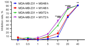 After coculture with M0/THP-1 or M1/THP-1 for 48 hours, MDA-MB-231 cells from the cocultures were collected and treated with different concentrations of SHD (0, 0.1, 0.5, 1, 5, 10, 20, and 40 mg/mL) for 48 hours and 72 hours. CKK-8 assay indicated that the coculture with M1/THP-1 had a greater inhibitory effect on MDA-MB-231 cell proliferation than did coculture with M0/THP-1, and the inhibition rates of 10 mg/mL SHD and 20 mg/mL SHD for 72 hours, respectively, were significant (P<0.05). Given the toxicity of SHD at a high concentration, the subsequent experiments included 10 mg/mL of SHD intervention for 72 hours as the experimental condition (Figure 2).