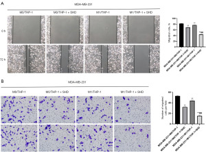 Wound-healing and transwell assays were implemented to assess the ability of SHD to inhibit the migration of MDA-MB-231 cells. After MDA-MB-231 cells were cocultured with M0/THP-1 or M1/THP-1 for 48 hours, 10 mg/mL of SHD was added for 72 hours, then MDA-MB-231 cells were collected and inoculated into a six-well plate and cultured for 24 hours, then the cells were scratched with pipette tips (shown in Figure 3). As shown in Figure 3A, compared with the migration rate in the MDA-MB-231 + M0/THP-1 group, those in the MDA-MB-231 + M0/THP-1 + SHD, MDA-MB-231 + M1/THP-1, and MDA-MB-231 + M1/THP-1 + SHD groups were significantly lower (P<0.01). Meanwhile, compared with the MDA-MB-231 + M0/THP-1 + SHD group, the MDA-MB-231 + M1/THP-1 + SHD group showed a greater inhibition in migration (P<0.01). As shown in Figure 3B, the number of migrated cells in the MDA-MB-231 + M0/THP-1 + SHD, MDA-MB-231 + M1/THP-1, and MDA-MB-231 + M1/THP-1 + SHD groups was significantly lowered compared with that in the MDA-MB-231 + M0/THP-1 group. This result confirmed that M1/THP-1 and SHD exerted a significant inhibitory effect on the migration of MDA-MB-231 cells, while SHD combined with M1/THP-1 exhibited more significant effects in this regard.