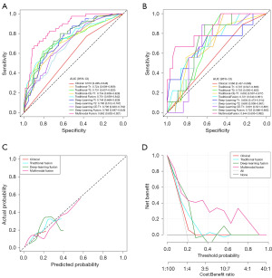 Table 2 and Figure 5 illustrate the performance metrics of various models. The clinical model exhibited AUC values of 0.572 and 0.566 in the training and testing cohorts, respectively, indicating the lowest performance. For the traditional radiomics models, AUC values in the training cohorts for T1, T2, and CE-T1 sequences were 0.724, 0.731, and 0.734, respectively. The corresponding AUC values in the testing cohorts were 0.707, 0.703, and 0.692. The traditional radiomics fusion model achieved AUC values of 0.751 and 0.721 in the training and testing cohorts, respectively, thereby outperforming the single-sequence models. In the deep learning radiomics models, the training cohort AUC values for T1, T2, and CE-T1 sequences were 0.749, 0.700, and 0.706, respectively, with testing cohort AUC values of 0.694, 0.685, and 0.691. Likewise, the deep learning radiomics fusion model demonstrated training and testing AUC values of 0.768 and 0.725, respectively, also surpassing the single-sequence models. Among the single-sequence models, traditional radiomics consistently outperformed deep learning radiomics, as evidenced by the superior performance of the T1 traditional radiomics model compared to the T1 deep learning radiomics model. In the comparison of multi-sequence fusion models, the deep learning radiomics fusion model outperformed the traditional radiomics fusion model. However, the DeLong test indicated no statistically significant difference between the deep learning radiomics fusion model and the other models (P>0.05). A detailed comparison of the DeLong test results among different models is provided in Table S3. Additionally, comprehensive information regarding sensitivity, specificity, PPV, and NPV for various models is presented in Table 2.