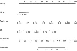 We constructed a multimodal fusion model that integrates clinical features with both traditional and deep learning radiomics features. The multimodal fusion model achieved an AUC of 0.862, a sensitivity of 0.675, a specificity of 0.875, and an accuracy of 0.832 in the training set. In the test set, it recorded an AUC of 0.844, a sensitivity of 0.667, a specificity of 0.919, and an accuracy of 0.869 (Table 2, Figure 5A,5B). Compared with other models, the multimodal fusion model demonstrated superior performance. Moreover, the DeLong test showed a statistically significant difference between the multimodal fusion model and the clinical model (P<0.05). Detailed results of the DeLong test comparing different models were provided in Table S3. The calibration curve, shown in Figure 5C, assessed the consistency between model predictions and actual outcomes, indicating that the multimodal fusion model exhibited the best calibration. The DCA, presented in Figure 5D, evaluated the clinical utility of the predictive model, confirming that the multimodal fusion model provides optimal value for clinical decision-making. Additionally, we also visualized the multimodal fusion model using a nomogram, as shown in Figure 6.