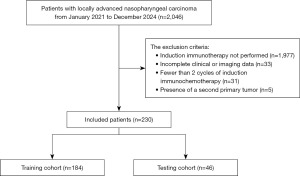 This study was approved by the Ethics Review Committee of Guangxi Medical University Cancer Hospital (No. KY2024886). As a retrospective analysis, informed consent was waived. The study was conducted in accordance with the Declaration of Helsinki and its subsequent amendments. We retrospectively analyzed 299 patients with LANPC who received induction immunochemotherapy at our center between January 2021 and December 2024. The inclusion criteria were as follows: (I) pathologically confirmed NPC; (II) stage III/IVA according to the American Joint Committee on Cancer (AJCC) 8th edition; (III) induction immunochemotherapy for 2–3 cycles; (IV) age ≥18 years and a Karnofsky performance status (KPS) ≥70. The exclusion criteria: (I) incomplete clinical or imaging data; (II) fewer than 2 cycles of induction immunochemotherapy; (III) presence of a second primary tumor. The patient selection flowchart is illustrated in Figure 1. Ultimately, a total of 230 patients were enrolled and randomly allocated to the training (n=184) and testing (n=46) cohorts at an 8:2 ratio. Specific details of the treatment plans for all patients are available at https://cdn.amegroups.cn/static/public/tcr-2025-1945-1.csv.