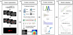 We used the “Py-radiomics” package to extract 1,015 traditional radiomics features from each of the three MRI sequences (T1, T2, and CE-T1), resulting in a total of 3,045 features per patient in accordance with the Imaging Biomarker Standardization Initiative (IBSI) guidelines (15). We employed the ResNet-18 convolutional neural network (CNN), which was pre-trained on the ImageNet dataset to extract deep learning radiomics features. The last fully connected layer of the CNN was removed and replaced with an average pooling layer for feature extraction. Each sequence yielded 512 features, culminating in a total of 1,536 deep learning radiomics features per patient. Guided gradient-weighted class activation mapping (Grad-CAM) is a technique that generates visual maps highlighting important regions in the final convolutional layer of the CNN (15). Consequently, we applied this method to emphasize specific sub-regions associated with the generation of deep learning features. The feature extraction process is shown in Figure 2B.