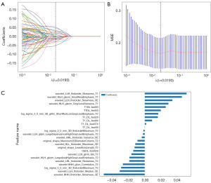 We excluded radiomics features with ICC <0.75. All traditional radiomics and deep learning radiomics features were standardized using Z-score. Feature selection included three methods. First, we employed Student’s t-test to filter features. Second, we assessed the linear correlation between features using the Spearman correlation coefficient to eliminate redundant features. If the correlation between any pair of features exceeded 0.9, we retained only one for further analysis (16). Third, we applied the least absolute shrinkage and selection operator (LASSO) with 10-fold cross-validation to identify the λ value corresponding to the minimum binomial deviation and selected the most significant features (17). The feature selection process is shown in Figure 2C.