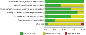 Study quality was evaluated using the Cochrane Risk of Bias Tool 2.0, which assessed randomization processes, allocation concealment, blinding, outcome reporting completeness, and attrition bias. Each domain was classified as low, high, or unclear risk.