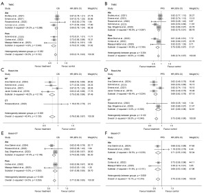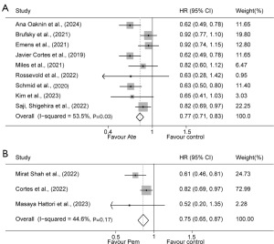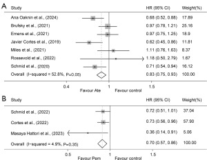 In TNBC patients, Ate-based regimens were associated with improved OS (HR =0.90; 95% CI: 0.78–1.04; I2=24.2%) and PFS (HR =0.83; 95% CI: 0.75–0.91; I2=49.0%), though statistical significance for OS was marginal. Pem + CT exhibited stronger OS benefits in this subgroup (HR =0.70; 95% CI: 0.57–0.86; I2=4.9%) (Figure 4A,4B).