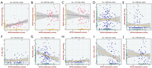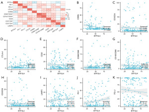 The clinical outcomes of diverse cancer patients are substantially affected by the amount and distribution of TIICs (22). We analyzed the relationship between BTF3L4 mRNA level expression and TIICs and immunoregulatory genes through GEO database. We obtained the datasets GSE116174, GSE144269, and GSE109211 from the GEO database. Spearman correlation analysis revealed that the expression level of BTF3L4 was positively associated with the expression of CTLA-4, while it showed a negative correlation with the levels of CD66b+ neutrophils and CD4+ T cells (Figure 4A-4J). Notably, the signs of the correlation coefficients in Figure 4B,4D,4E are inconsistent with the directions of the trend lines, which can be attributed to the influence of a small number of extreme outliers. Accordingly, the directions of the linear trend lines are adopted as the primary basis for characterizing the correlations between variables.