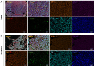 The following primary antibodies were used: anti-cytokeratin (CK) antibody (1:1,000, Orb69073, Biorbyt, Cambridge, UK), anti-BTF3L4 antibody (1:250, Orb511711, Biorbyt), anti-CD3e antibody (1:3,000, 85061S, CST, Danvers, MA, USA), anti-CD4 antibody (1:100, ab133616, Abcam, Cambridge, UK), anti-CD8 antibody (1:200, 85336S, CST), anti-CD20 antibody (1:200, ab78237, Abcam), anti-CD66b antibody (1:10,000, arg66287, Arigo, Zhubei, China), anti-CD68 antibody (1:10,000, 76437S, CST), anti-CD86 antibody (1:100, MAB1774, R&D Systems, Minneapolis, MN, USA), anti-CD163 antibody (1:100, 93498S, CST), anti-Lamp3 antibody (1:500, ab111090, Abcam), anti-PD-1 antibody (1:500, 86163, CST), anti-PD-L1 antibody (1:100, 13684S, CST), anti-cytotoxic T-lymphocyte-associated antigen 4 (anti-CTLA-4) (1:2,000, Orb527271, Biorbyt). Following antibody staining, the cell nuclei underwent staining with a DAPI staining solution (Sigma, St. Louis, MO, USA), and specimens were prepared for examination. The prepared slides underwent scanning through the Vectra Automated Quantitative Pathology Imaging System (version 3.0; PerkinElmer, Shelton, CT, USA). All experimental reagents used in the experiment were from the same batch.