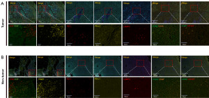 We constructed TMAs using paraffin-embedded liver tissue samples and performed mIHC staining as previously described (21). Serial TMAs were employed in this study. All the TMAs were prepared from samples with consistent embedding time and identical storage conditions. Meanwhile, it was verified that the corresponding positions on all TMAs are anatomically identical. TMA slides were dewaxed, dehydrated, and exposed to antigen retrieval utilizing 10 mM sodium citrate buffer (pH 6.0) with microwave heating. The staining procedure involved sequential treatments with primary and secondary antibodies, followed by signal amplification using an Opal fluorophore-binding tyramide signal amplification system (Akoya Biosciences, Marlborough, MA, USA). This process was conducted iteratively until the biological specimens were tagged with a predetermined array of distinct identifiers.