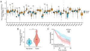 We assessed the BTF3L4 mRNA levels in HCC and non-tumor tissues using the TCGA database. Our research results show that BTF3L4 is differentially expressed in various tumors, including HCC (Figure 1A). Compared with non-tumor tissues, the expression of BTF3L4 mRNA in HCC tissues was significantly increased (Figure 1B, P<0.001). Furthermore, based on the downloaded original TCGA mRNA data (expression range, 2.122–5.440), we selected the median value of 3.456 as the cut-off. Scores ≤3.456 were classified as low expression, and scores >3.456 were classified as high expression. Then we identified a significant association between elevated BTF3L4 mRNA levels and adverse clinical outcomes in HCC patients (Figure 1C, P=0.001). These observations highlight the possible prognostic value of BTF3L4 mRNA expression in individuals with HCC.